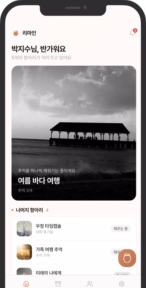 리마인은 항아리라는 감성적인 개념으로 추억을 담고 봉인하는 경험을 제공해요. 봉인 후에도 그룹 멤버와 항아리 채팅이 가능하고, 개봉일에는 특별한 세레모니와 함께 추억을 꺼내볼 수 있어요. 추억을 예쁜 공유 카드로 만들어 SNS에 나눌 수도 있어요.